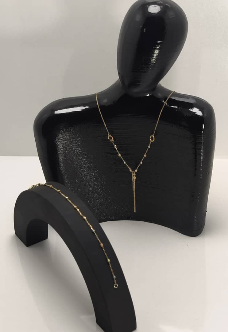 نیم ست البرنادو وزن کل: 3/930 گرم وزن زنجیر: 2/580 گرم طول زنجیر: 50 سانتی متر وزن دستبند: 1/340 گرم طول ستبند: 17 سانتی متر